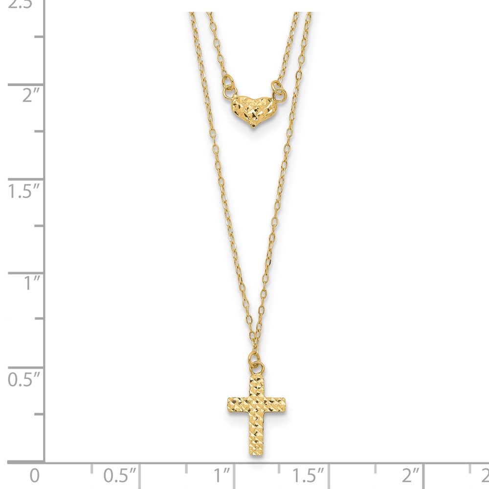 14k Polished 2-Strand Diamond-cut Cross and Heart 16 inch Necklace Plus 2 inch Extender (SF2524-16)