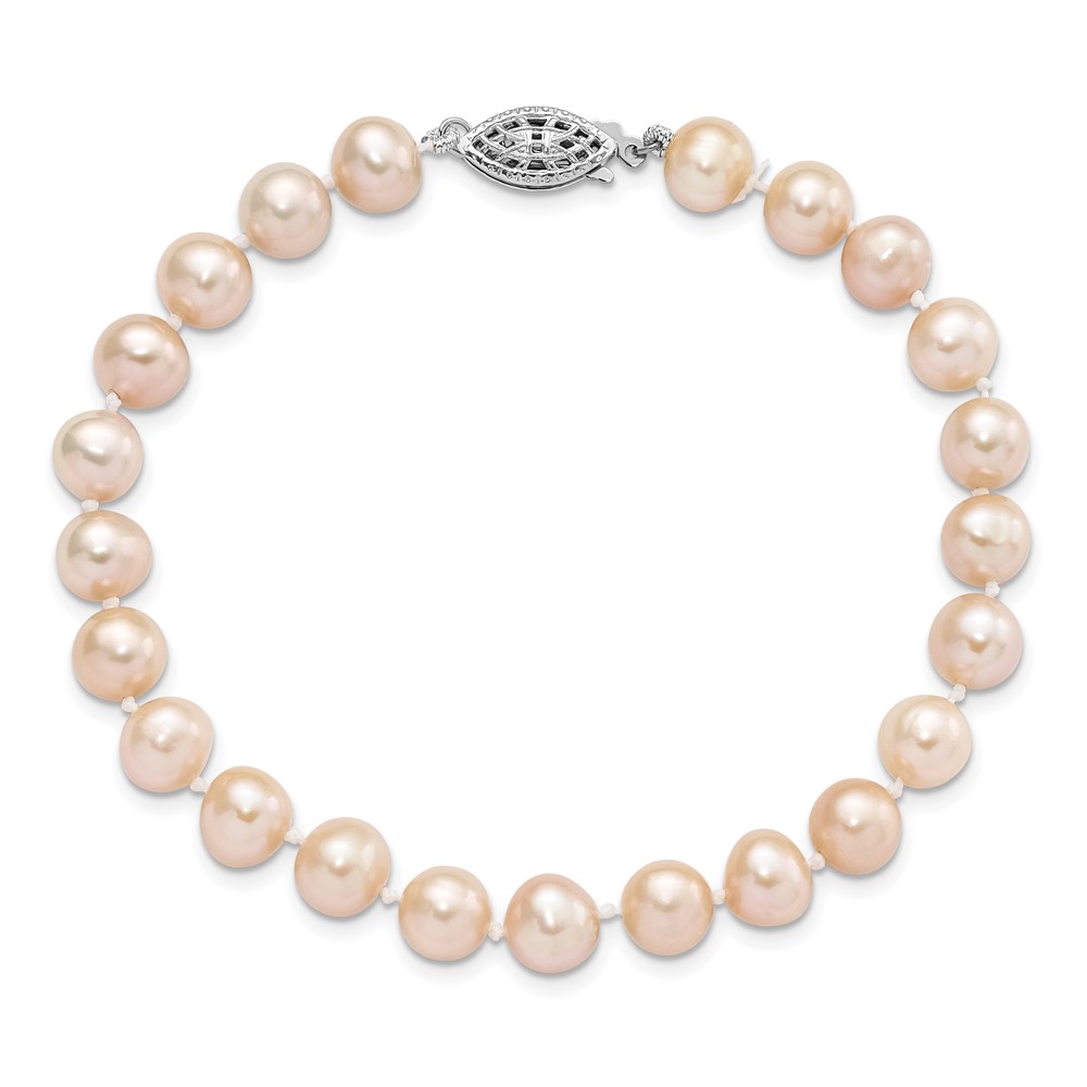 Sterling Silver Rhodium-plated 7-8mm Pink Near-Round Freshwater Cultured Pearl 7.25 inch Bracelet (QH5167-7.25)