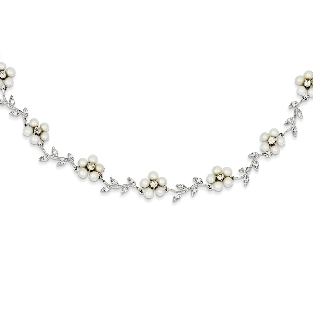| Fine Jewelry | Sterling Silver Rhodium-plated CZ Vine Pattern and Fresheater Cultured Pearl Floral 16 inch Necklace