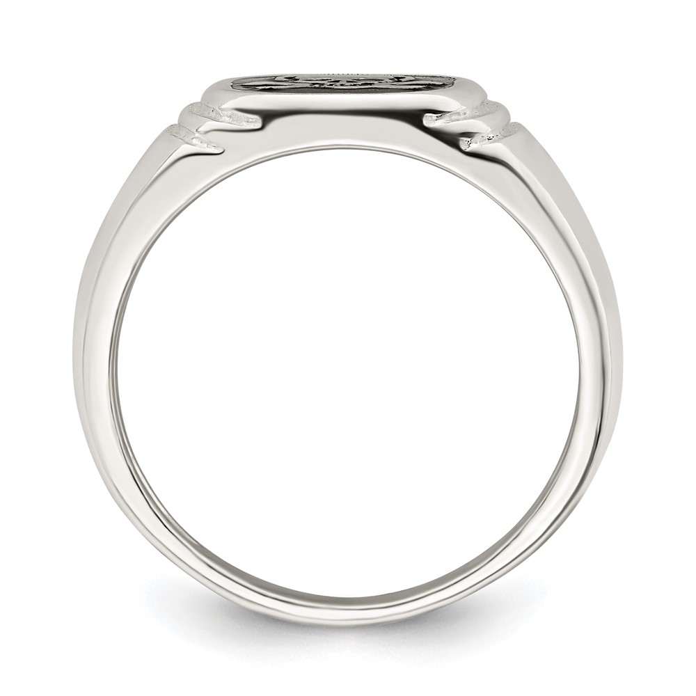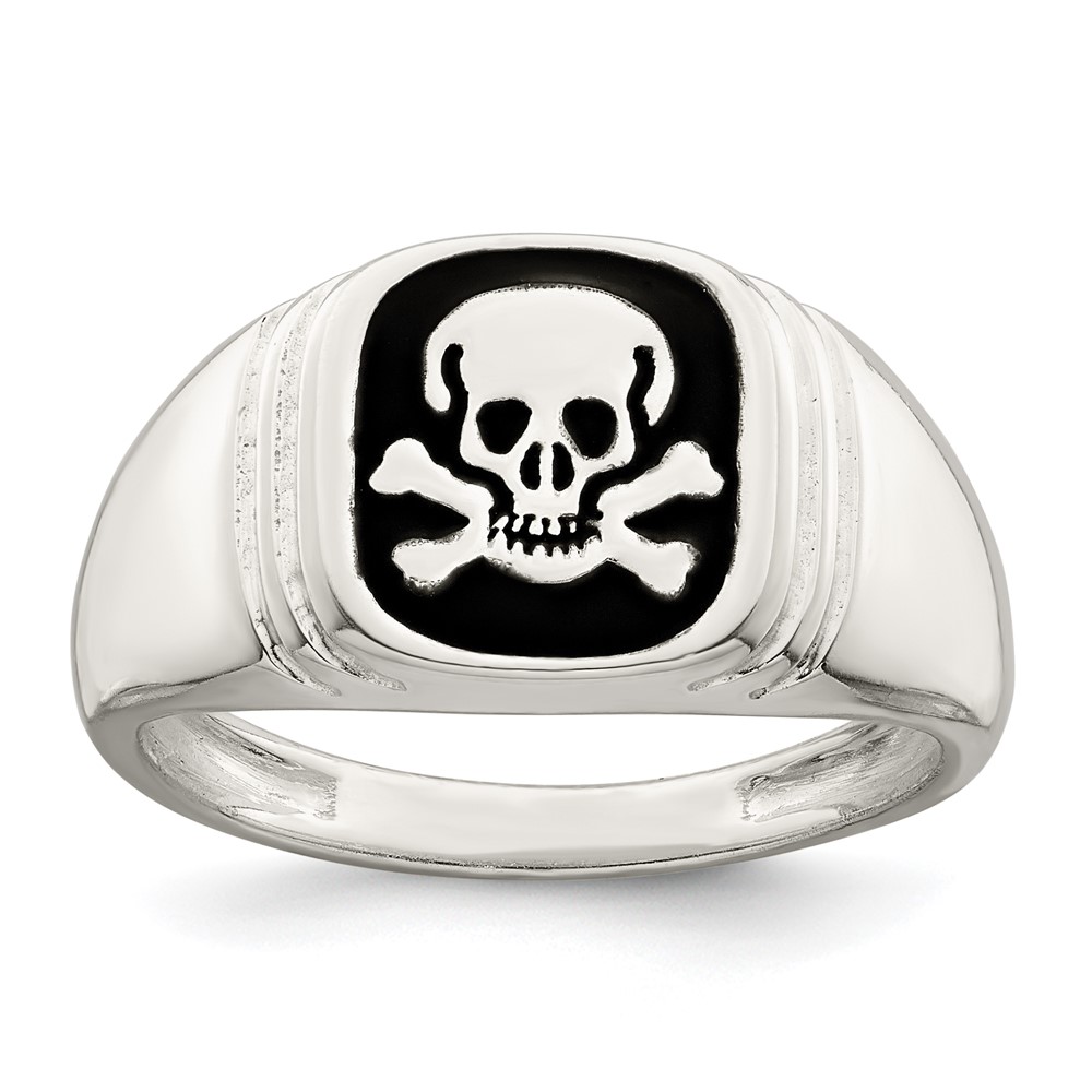 Sterling Silver Black Enameled Mens Skull and Crossbones Ring (QR7412-9)